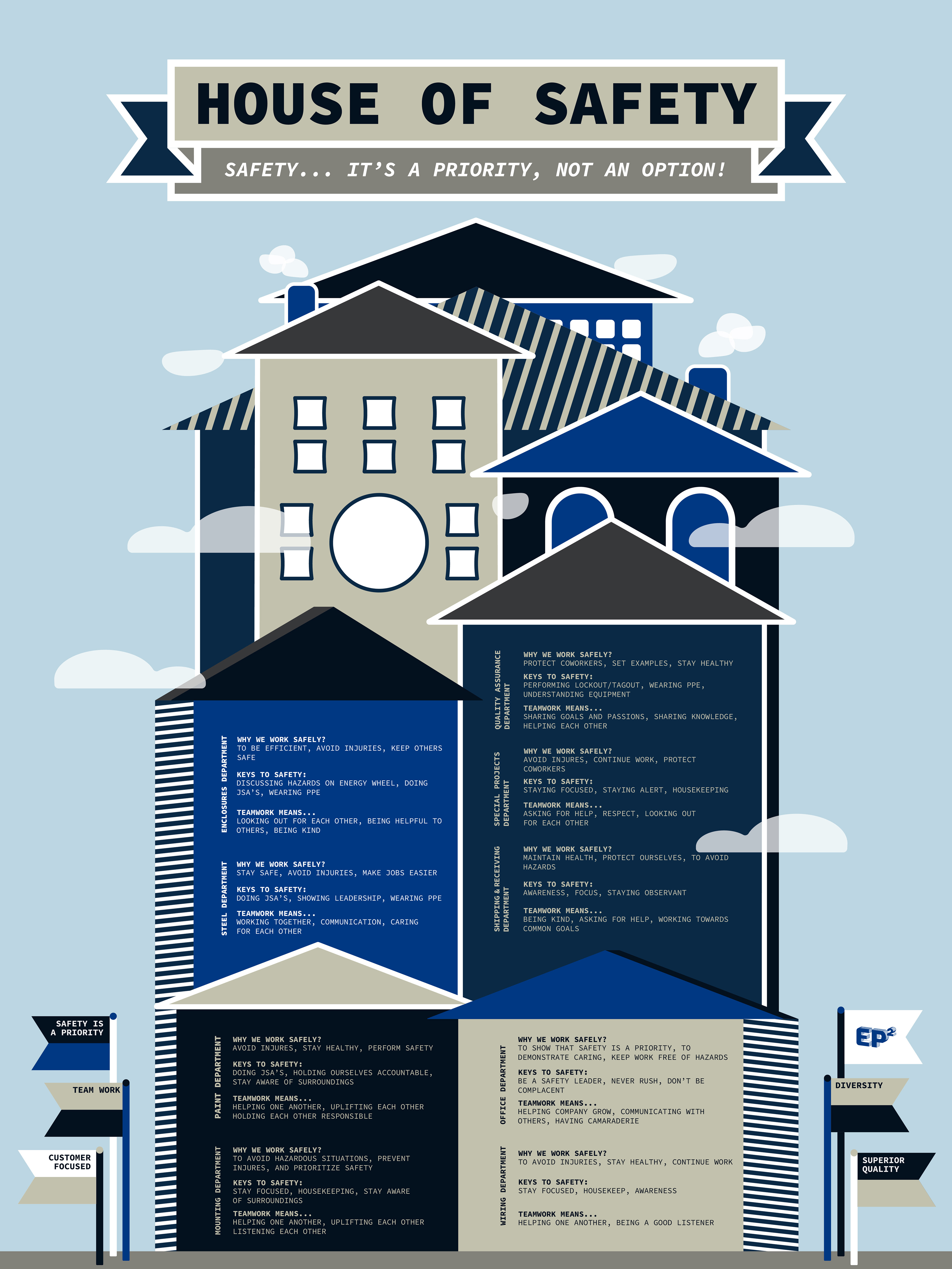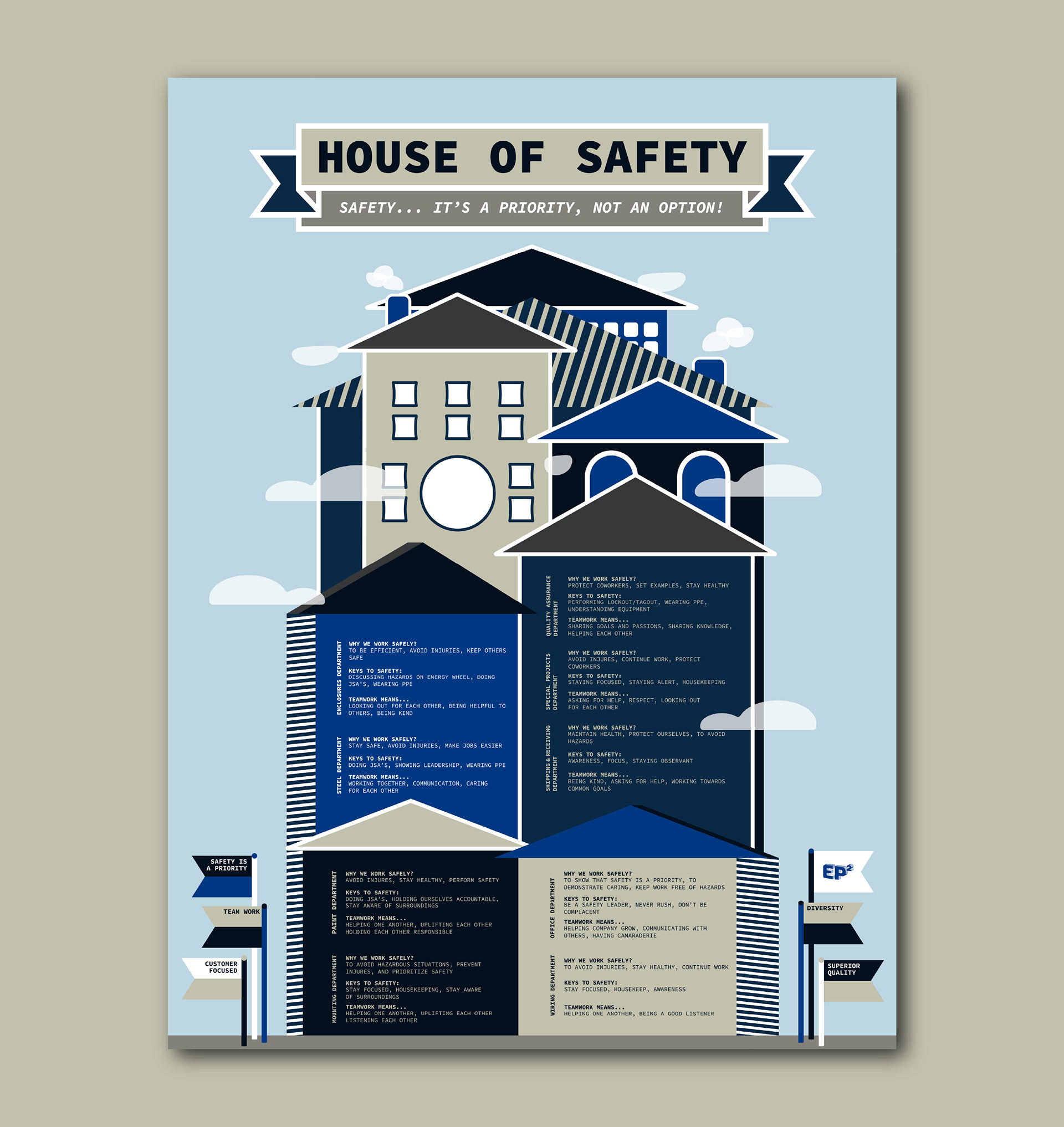 Electrical Power Products prioritizes their employee safety. They tasked me with the project to create a poster that portrays their safety goals within their "house".