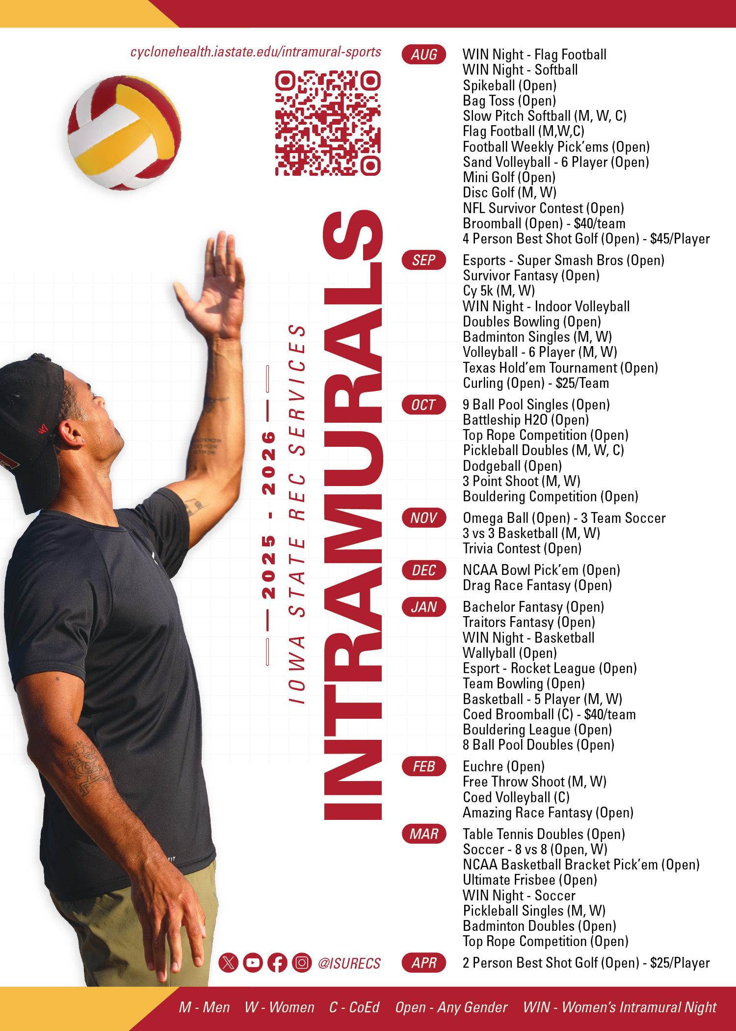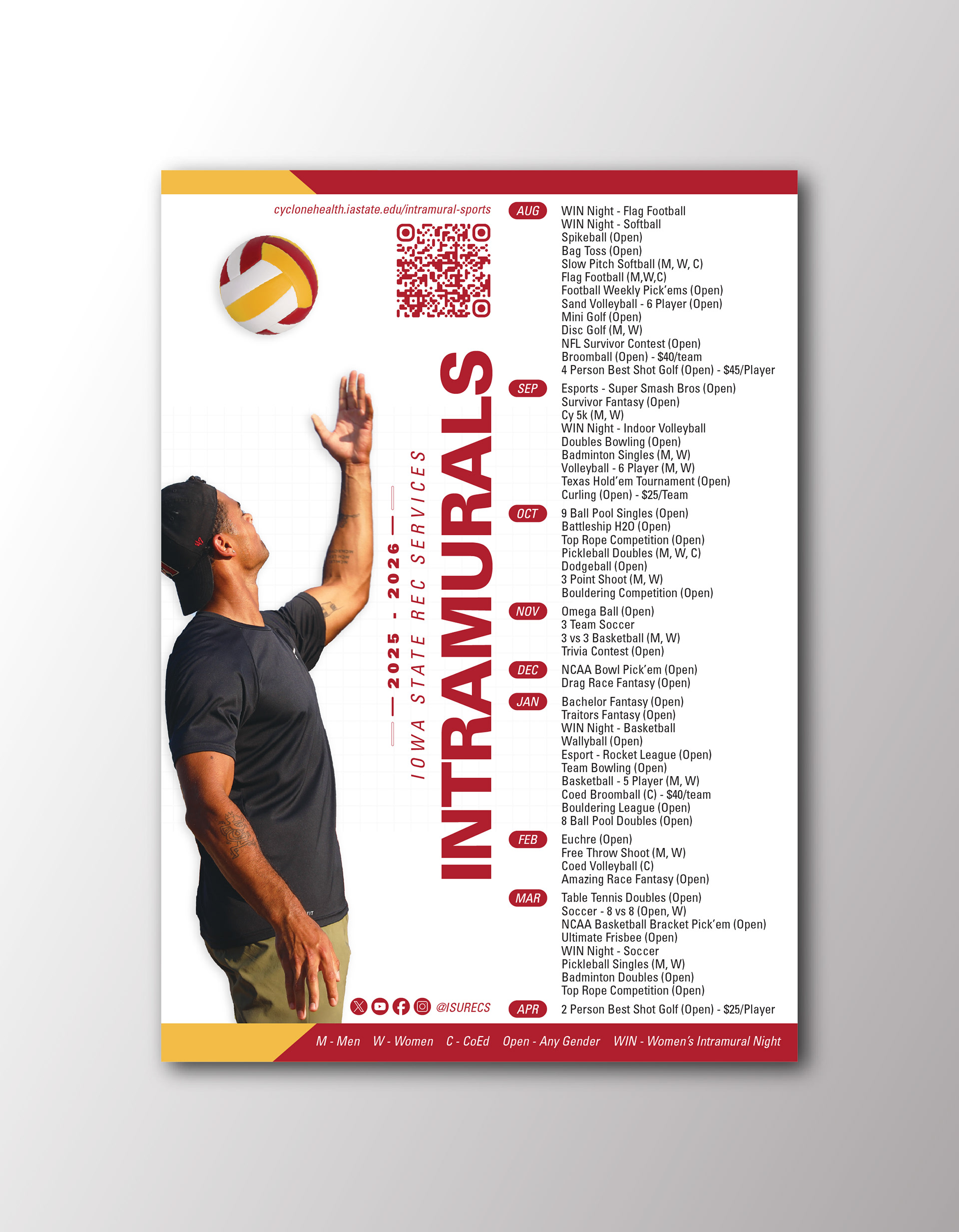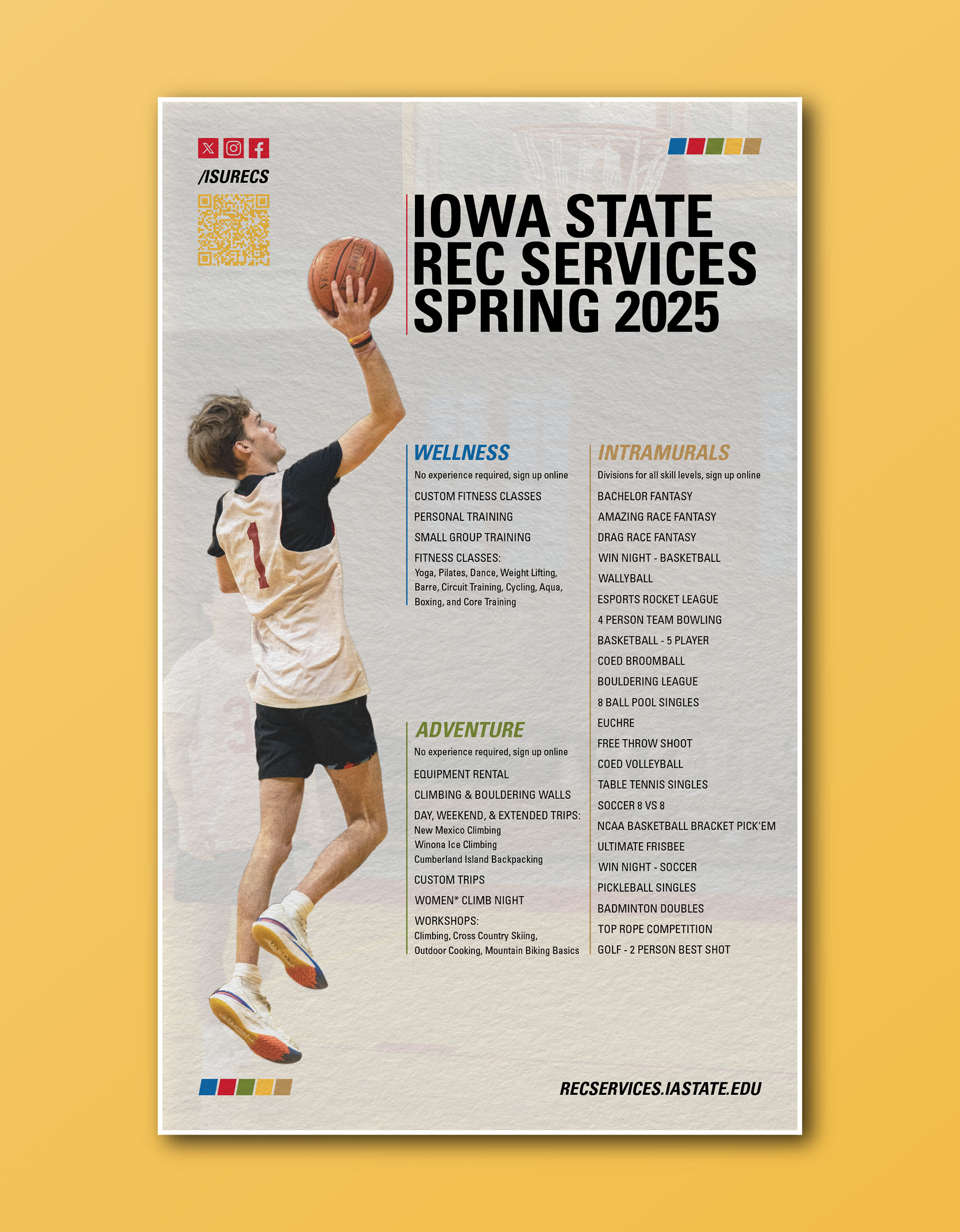 My design has been selected as the official poster for Iowa State University's Rec Services Spring 2025 promotional campaign. The poster aims to comprehensively highlight all the recreational facilities, programs, and activities available to students throughout the spring semester.
